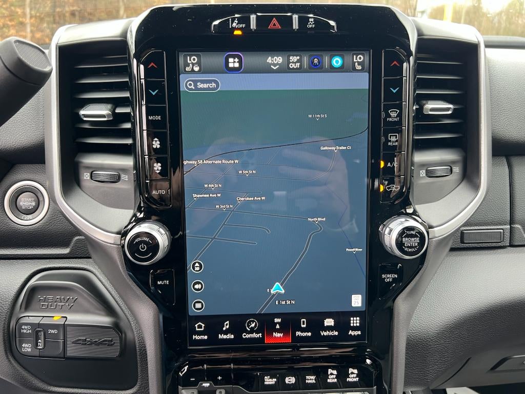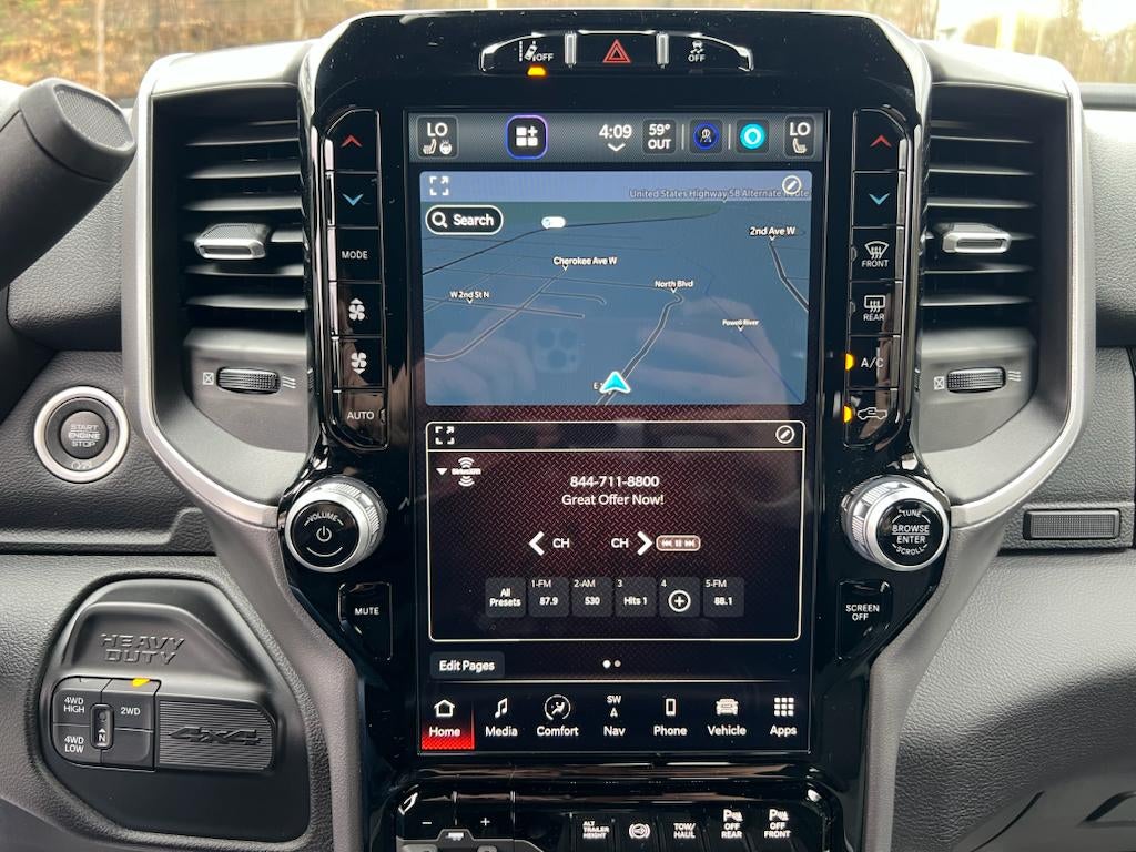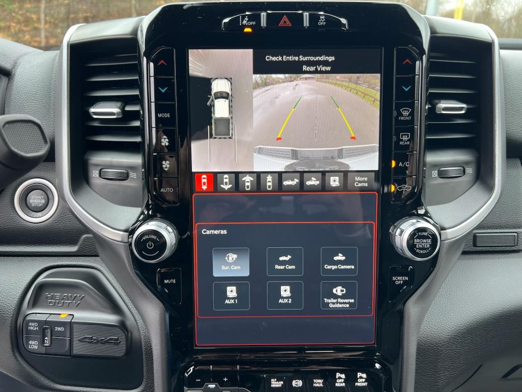 Night Edition: Black Ram Head Tailgate Badge; 20" X 8.0" Black Painted Aluminum Wheels; Black Headlamp Bezels; Body Color Door Handles; Painted Front Bumper; Painted Rear Bumper; Gloss Black Grille Nostrils/mic; LT285/60R20E OWL On/off Road Tires; Black Exterior Truck Badging; Body Color Grille Surround; Black Interior Accents; Black Tail Lamp Bezels; ParkSense Front/rear Park Assist System. Safety Group: Auto High Beam Headlamp Control; Rain Sensitive Windshield Wipers; Rear View Auto Dim Mirror; Adaptive Cruise Control with Stop; Adaptive Steering System; Full Speed Forward Collision Warning Plus; Lane Keep Assist. Tech Package: Center Stop Lamp with Cargo View Camera; 9 Alpine Speakers with Subwoofer; Surround View Camera System; Front LED Fog Lamps; LED Reflector Headlamps; Uconnect 5 Navigation with 12.0" Display Radio; Trailer Reverse Guidance. Bed Utility Group: MOPAR Spray in Bedliner; MOPAR Deployable Bed Step; LED Bed Lighting. Quick Order Package 2HZ Big Horn. Level 2 Equipment Group: Rear Window Defroster; Blind Spot and Cross Path Detection; Power Adjustable Pedals; Leather Wrapped Steering Wheel; Rear Power Sliding Window; Rear Dome with On/off Switch Lamp; Front Fog Lamps; Glove Box Lamp; Auto Power-Folding Mirrors; Footwell Courtesy Lamp; Media Hub with 2 Charge Only USBs; Exterior Mirrors with Heating Element; Heated Front Seats; Mirror Running Lights; Heated Steering Wheel; Foam Bottle Insert (door Trim Panel); Black Exterior Mirrors; Dampened Tailgate; Security Alarm; Big Horn Instrument Panel Badge; Power Adjustable Convex Aux Mirrors; Forward and Reverse Utility Lights; Locking Lower Glove Box; Remote Start System; Uconnect 5 Navigation with 12.0" Display Radio; Power Heated Fold Telescope Mirrors; Exterior Mirrors with Supplemental Signals; Steering Wheel Mounted Audio Controls; Exterior Mirrors Courtesy Lamps; Dual Glove Boxes; 115-Volt Auxiliary Front Power Outlet; Cluster 7.0" TFT Color Display; Universal Garage Door Opener; Center Hub; Power Adjust Mirrors; 2nd Row in Floor Storage Bins; Power Telescoping Mirrors; Sun Visors with Illuminated Vanity Mirrors; ParkSense Front/rear Park Assist System. Uconnect 5 Navigation with 12.0" Display Radio. Auto Level Rear Air Suspension. Blind Spot and Cross Path Detection. MOPAR Spray in Bedliner. 9 Alpine Speakers with Subwoofer. 5th Wheel/gooseneck Towing Prep Group. ParkSense Front/rear Park Assist System. Center Stop Lamp with Cargo View Camera. Premium Cloth Bucket Seats. Remote Start System. 115-Volt Auxiliary Front Power Outlet. Front Fog Lamps. Rear Window Defroster. Security Alarm. Tow Hooks. **Equipment listed is based on original vehicle build and subject to change. Please confirm the accuracy of the included equipment by calling the dealer prior to purchase.**